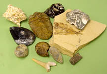 Compare the fossils to the present day organisms and try to find out which ones are related. Kit includes one of each of the following: ammonite, shark tooth, crinoid stem, turretella agate, brachiopod, belemnite, fossil sea urchin spine, trilobite, and fossil fish.