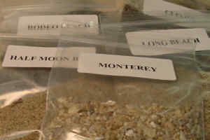 Display kit includes 16 sands from California and 1 from New York. The principles emphasized are: mother rocks have baby rocks by erosion, sand can be characterized by size, roundness, and sorting, sands from different areas far away can look very similar. Includes informational and activity guide.
