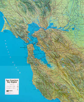 Shows south to Santa Cruz and North to Point Reyes. Clearly shows the mountain and valleys that outline the San Andreas fault system.