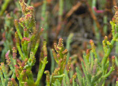 Common Pickleweed Salicornia pacifica 24" tall The pickle like stems of this marsh plant give it it's name. It gets rid of salt by concentrating it in the red tipped stems which are shed every fall. |
